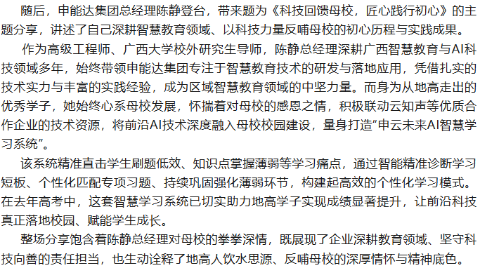 智启AGI新时代·共筑崭新未来 | 申能达总经理陈静返校演讲,以科技反哺母校初心